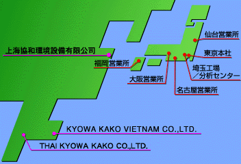日本国内在东京还设有子公司,分别在大阪、名古屋等六个城市设有营业所,在埼玉县有生产制造工厂。日本国内从业人员有210人。另外在中国的上海、泰国的曼谷、越南的胡志明市分别设有子公司。在上海的子公司就是上海协和环境设备有限公司(以下简称上海协和公司)。